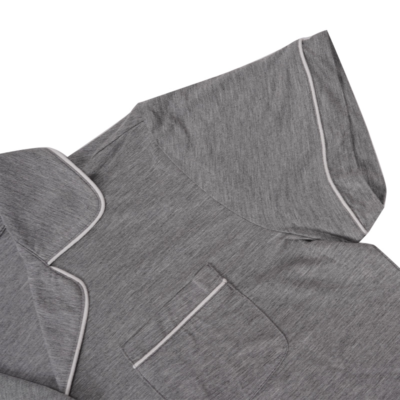 The pajama top features a structured lapel collar combined with a zip-button closure, offering a more contemporary and functional alternative to traditional button-only designs. This collar style enhances the overall silhouette and makes the set suitable for premium retail positioning and fashion-forward sleepwear brands.